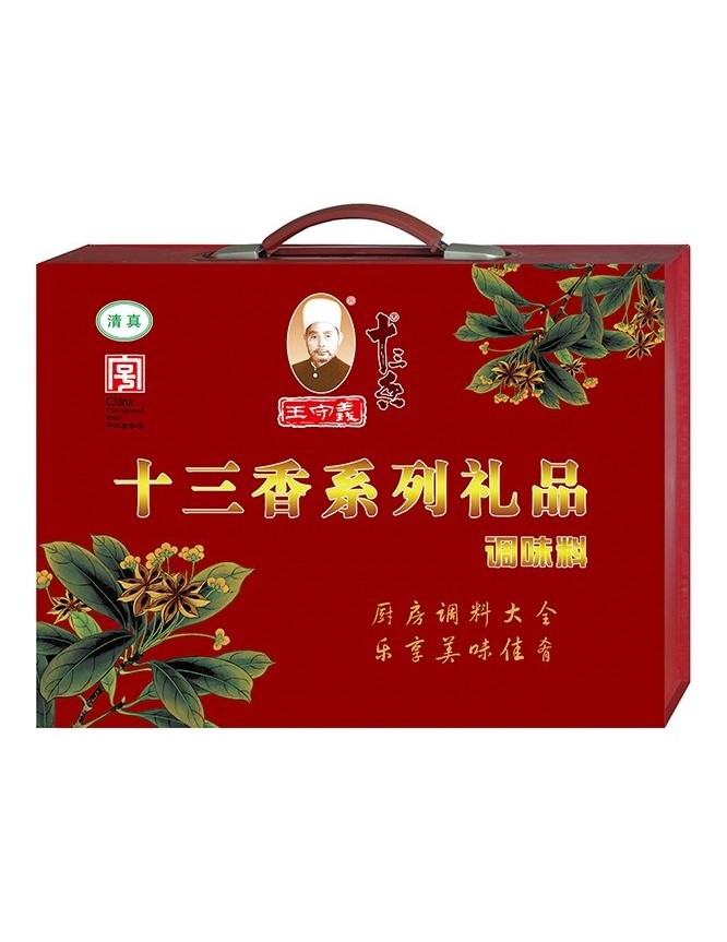 內(nèi)裝調(diào)味料:十三香調(diào)味品(醇厚型)30克×2,麻辣鮮調(diào)味料55克×2,十三香調(diào)味品(金卡)45克,十三香調(diào)味品45克,白胡椒粉45克×2,黑胡椒粉45克×2,包子餃子調(diào)味料30克×2,燉肉料20克,燉雞料24克,花椒粉30克,精姜粉50克,炸雞料調(diào)味料(香酥)45克,炸雞料調(diào)味料(麻辣)45克,雞精調(diào)味料(鮮美)40克×2 。